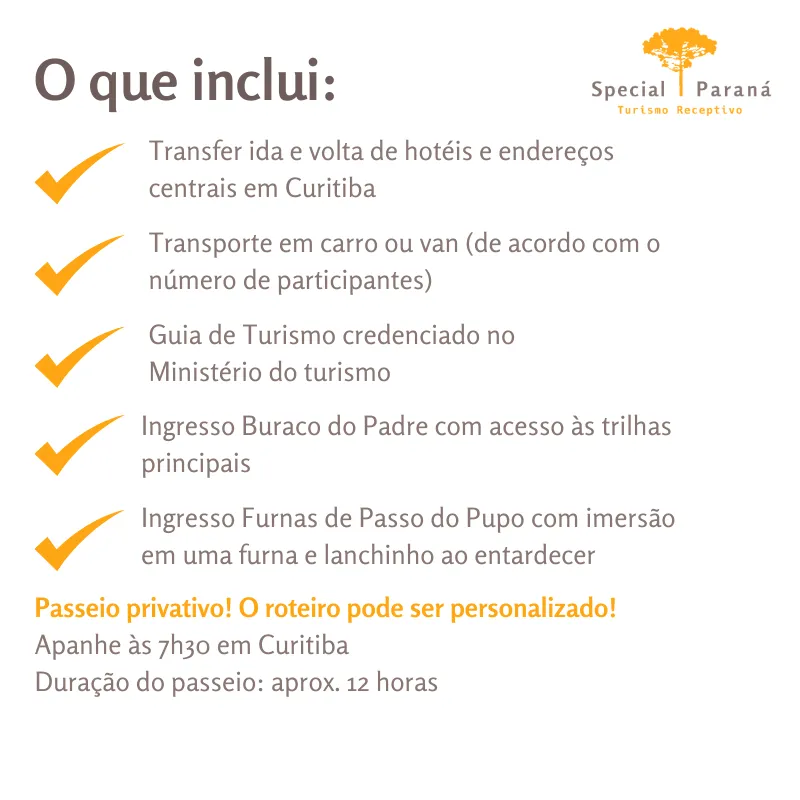 Serviços inclusos: transfer a partir do seu hotel ou endereço central em Curitiba (ida e volta), transporte em carro ou van executiva (dependendo do número de pessoas no dia do passeio), acompanhamento de guia de turismo credenciado no Ministério do Turismo, ingresso de entrada no Buraco do Padre e às Furnas Passo do Pupo e lanche (sanduíche e bolo) no Passo do Pupo.