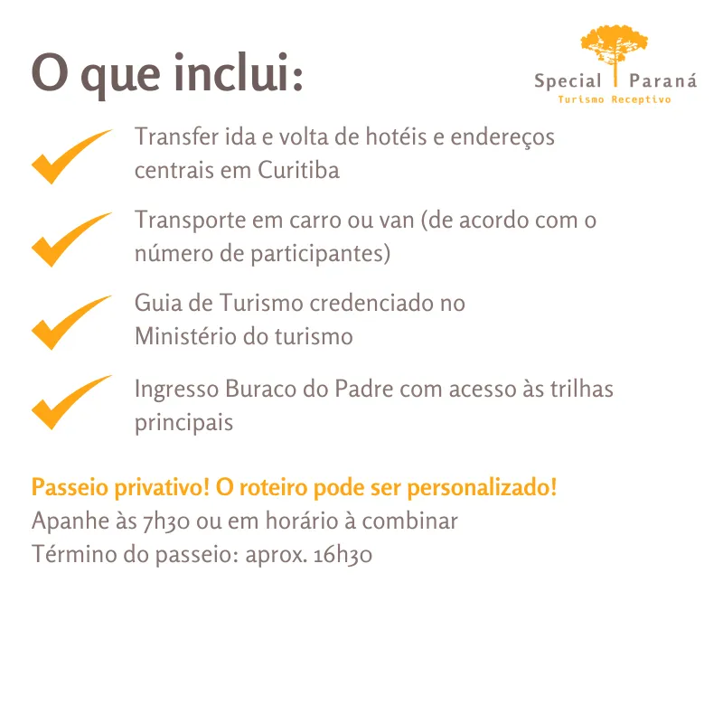 Serviços inclusos: transfer a partir do seu hotel ou endereço central em Curitiba (ida e volta), transporte em carro ou van executiva (dependendo do número de pessoas no dia do passeio), acompanhamento de guia de turismo credenciado no Ministério do Turismo, ingresso de entrada no Buraco do Padre.
