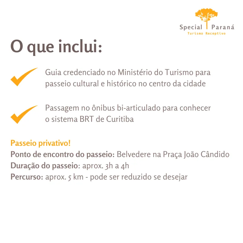 Ponto de encontro: em frente ao Belvedere (construção amarela) na Praça João Cândido – Curitiba. O passeio tem duração de 3h30 a 4h.