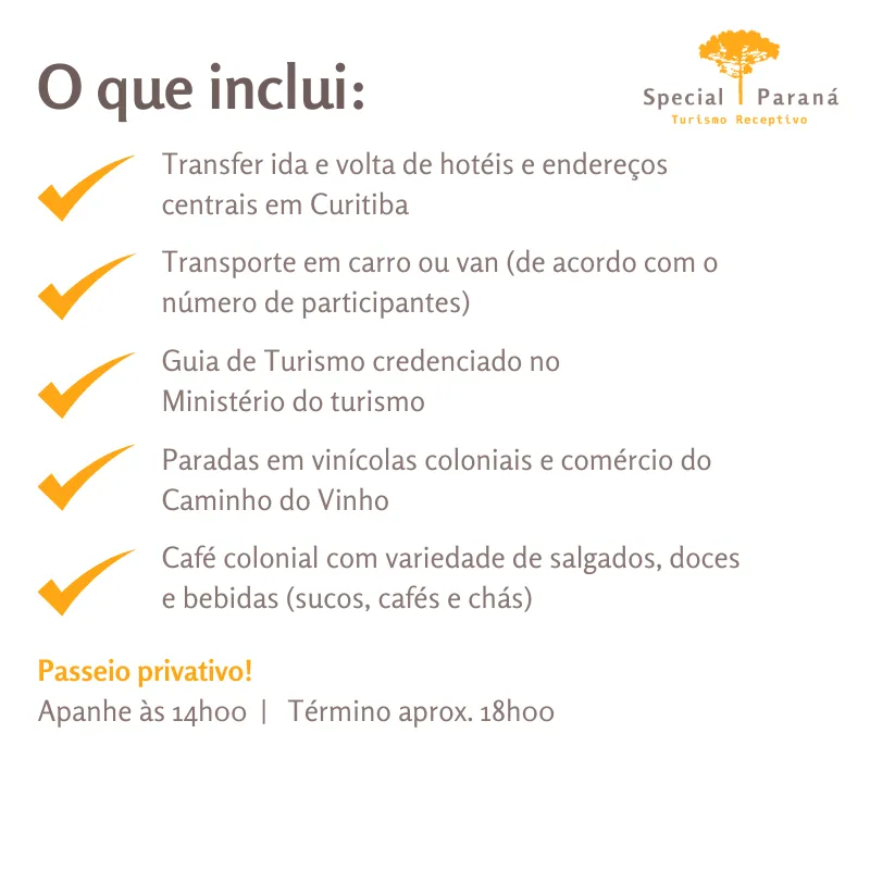 Horário de saída de hotéis ou endereços centrais em Curitiba: 14h00 / Duração do passeio: aprox. 4 horas.