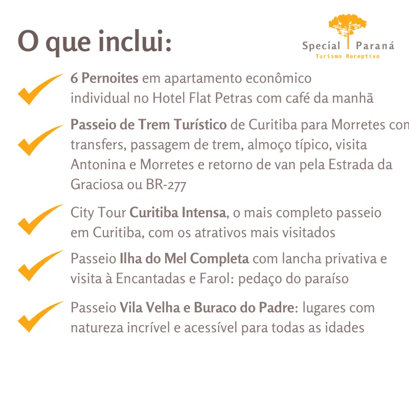 - Um pacote completo e confortável para quem viaja sozinho(a): você terá o melhor de Curitiba e região sem se preocupar com nada!