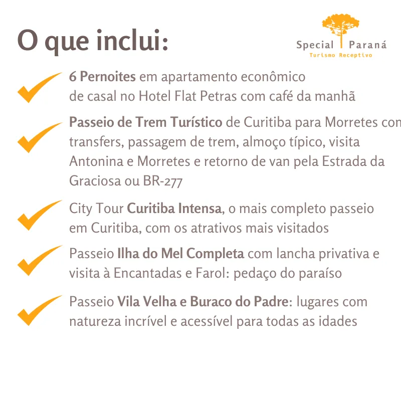 Não estão inclusos: bebidas no almoço do passeio de trem, almoço no city tour, Ilha do Mel e Vila Velha / Buraco do Padre, estacionamento, despesas pessoais, transporte da sua cidade de residência até Curitiba, etc.