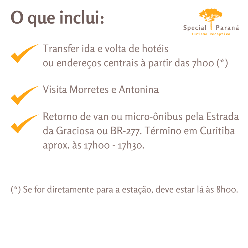 - Você terá transfer de ida e volta de hotéis ou endereços centrais em Curitiba à partir das 7h. Se preferir, pode ir diretamente para a Estação Ferroviária por conta própria. Informe onde estará hospedado ou reserve seu hotel conosco!