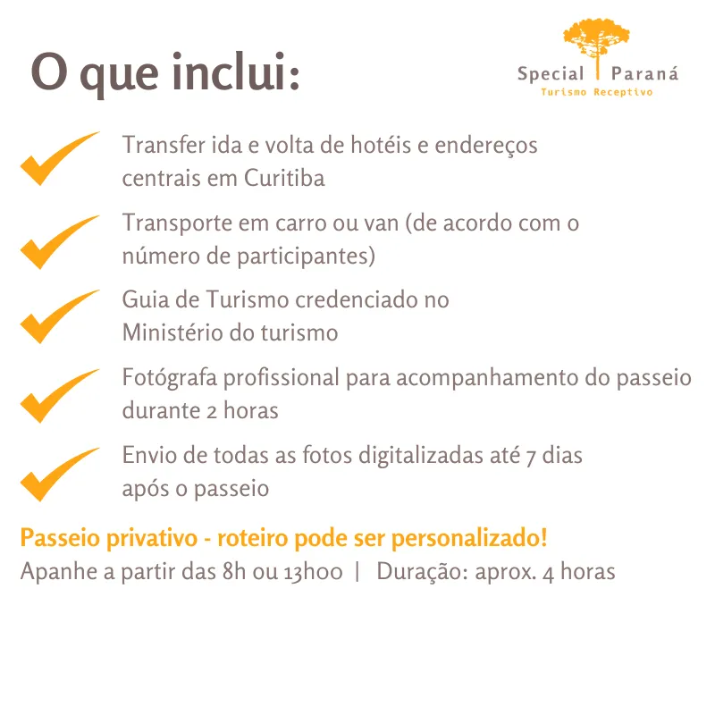 . Nosso guia irá buscá-lo no hotel ou endereço central em Curitiba. Para ter mais cenários para as fotos, recomendamos a área central, setor histórico ou o Centro Cívico com o Museu Oscar Niemeyer. Mas você poderá escolher o lugar que preferir, como o Jardim Botânico, por exemplo.