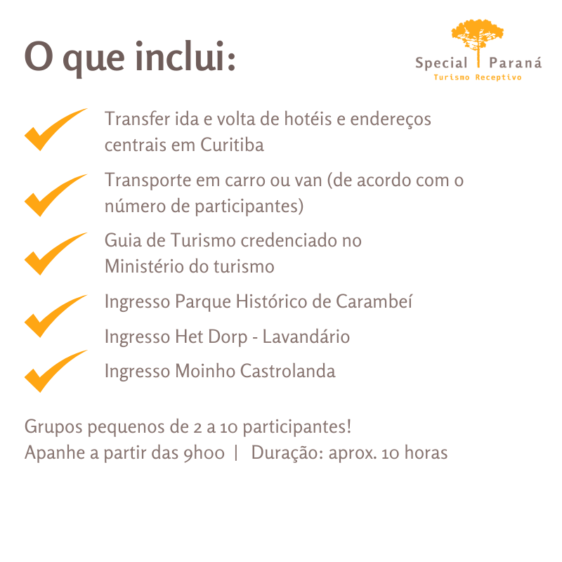 Serviços inclusos: transporte em carro ou van executiva (dependendo do número de pessoas no dia do passeio), acompanhamento de guia de turismo credenciado no Ministério do Turismo, ingressos de entrada ao Parque Histórico de Carambeí, ao lavandário Het Dorp e ao Memorial da Imigração e Moinho de Castrolanda.