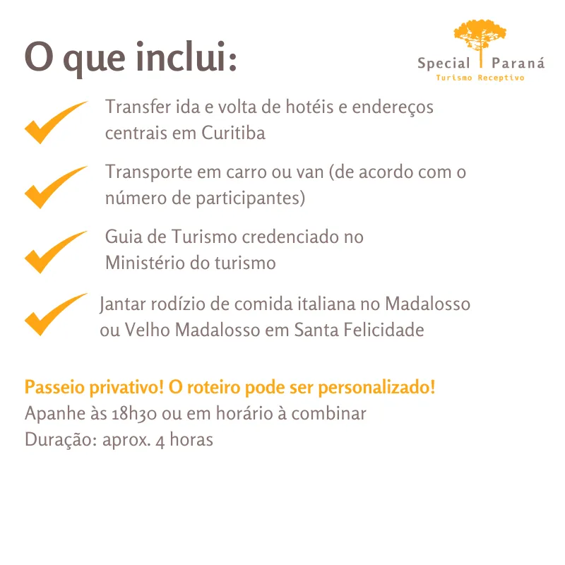Conheça os pontos iluminados de Curitiba em um passeio panorâmico privativo, exclusivo para você. O roteiro inclui paradas no Jardim Botânico, Museu Oscar Niemeyer, Ópera de Arame (se não houver evento), Parque Tanguá, Memorial Ucraniano e finaliza com jantar em Santa Felicidade, um bairro gastronômico de origem italiana.