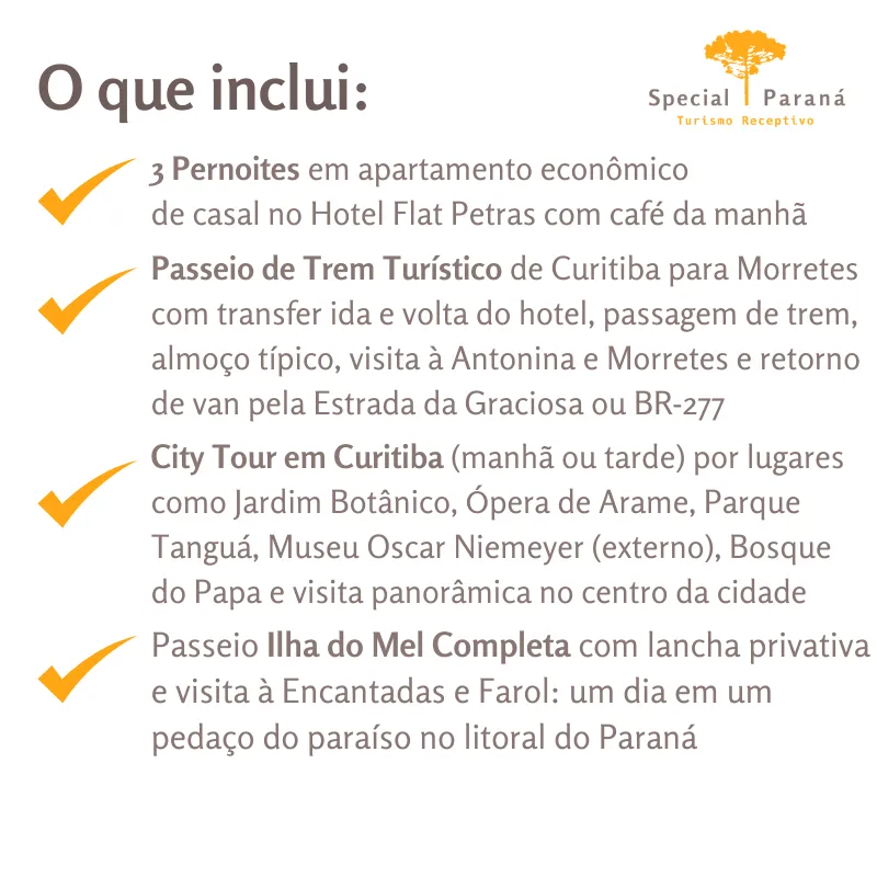 Não estão inclusos: bebidas no almoço do passeio de trem, almoço na Ilha do Mel, estacionamento, despesas pessoais, transporte da sua cidade de residência até Curitiba, etc.
