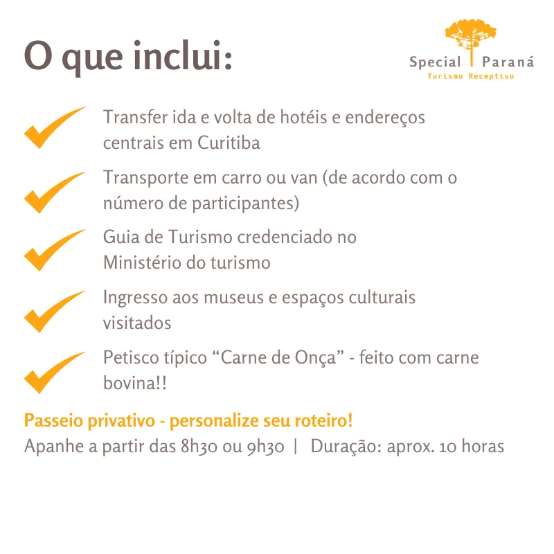 Opção A: saída às 8h30 – Museu do Holocausto, Museu de Arte Indígena, “carne de onça” como aperitivo em um típico boteco curitibano, Palacete dos Leões, Parque Barigui, Santuário Schonstatt e finaliza em uma confeitaria com vista panorâmica da cidade