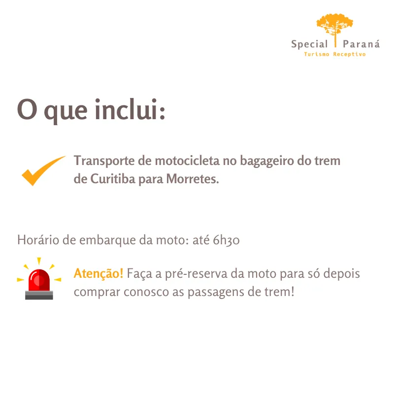 Só vendemos o lugar da moto se você comprar a passagem de trem conosco. Temos opções da turística à luxo, com vários níveis de conforto.