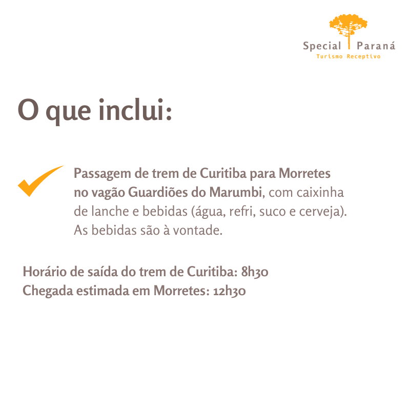 Você comprará somente a passagem de trem na categoria Guardiões do Marumbi de Curitiba para Morretes. O restante é com você!