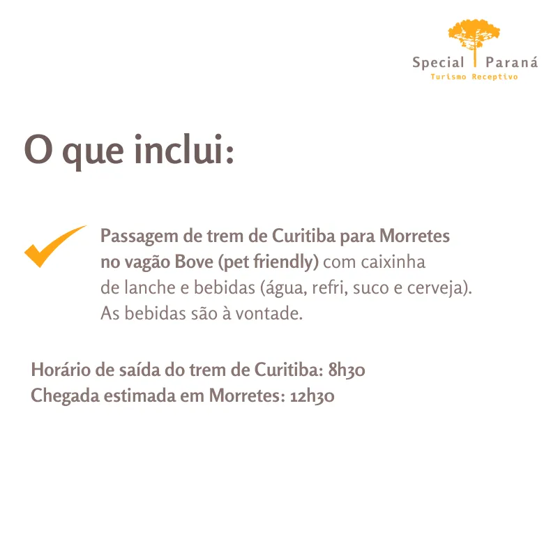 Você comprará somente a passagem de trem na categoria Bove / Pet de Curitiba para Morretes. O restante é com você!