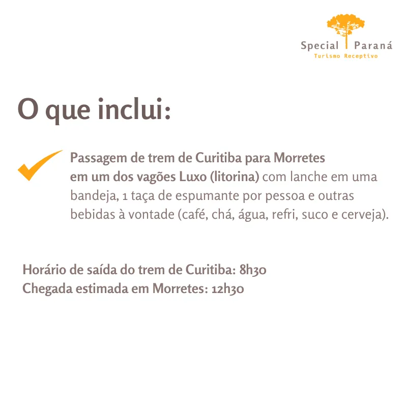 Você comprará somente a passagem de trem na categoria Trem de Luxo de Curitiba para Morretes. O restante é com você!