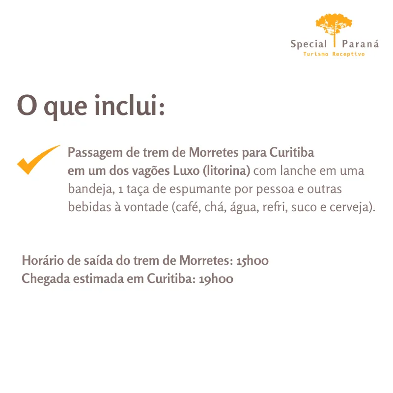 Você comprará somente a passagem de trem na categoria luxo de Morretes para Curitiba. O restante é com você!
