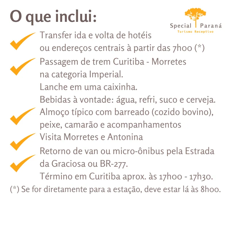 Que tal o passeio em uma categoria muito elegante e romântica? Neste passeio tem transfer de ida e volta em endereços centrais, inclui a passagem de trem categoria Imperial, almoço típico, visita Antonina e volta de van.