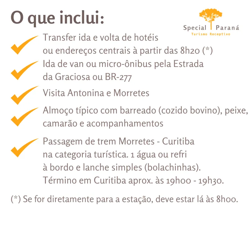 Este passeio é operado pela Special Paraná em parceria com outra empresa. Dependendo dos horários de abertura e do andamento do passeio o guia poderá ou não fazer uma parada em uma fábrica de balas de bananas e em um mirante. Converse com o guia no início do passeio para detalhes da programação.