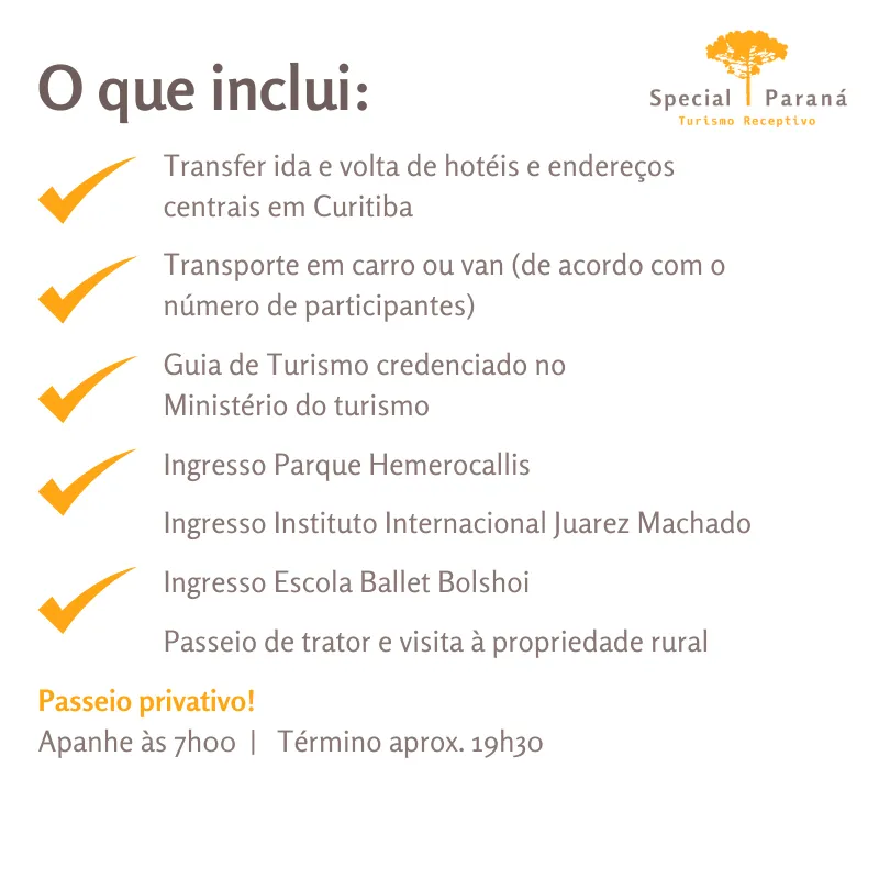 Transporte privativo com saída de local central em Curitiba (carro ou van), guia de turismo cadastrado no Ministério do Turismo, ingresso para o Parque Hemerocallis, ingresso do Instituto Internacional Juarez Machado, ingresso da visita guiada na Escola Teatro Bolshoi, ingresso para visitação e passeio de trator.