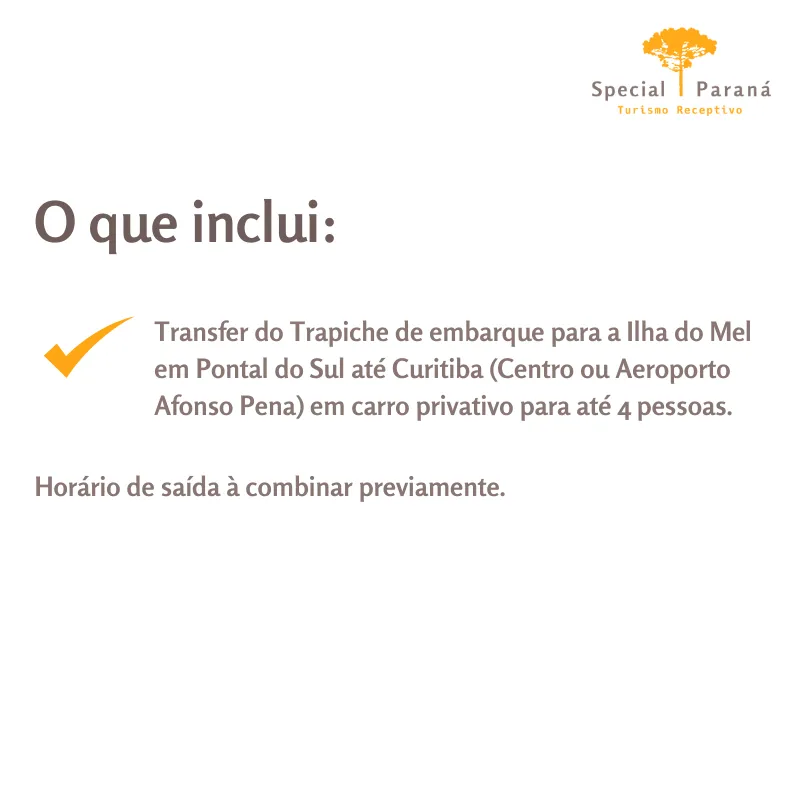 📍 Local de saída: Terminal de Embarque da Ilha do Mel em Pontal do Sul | Local de destino: Centro de Curitiba ou Aeroporto Afonso Pena