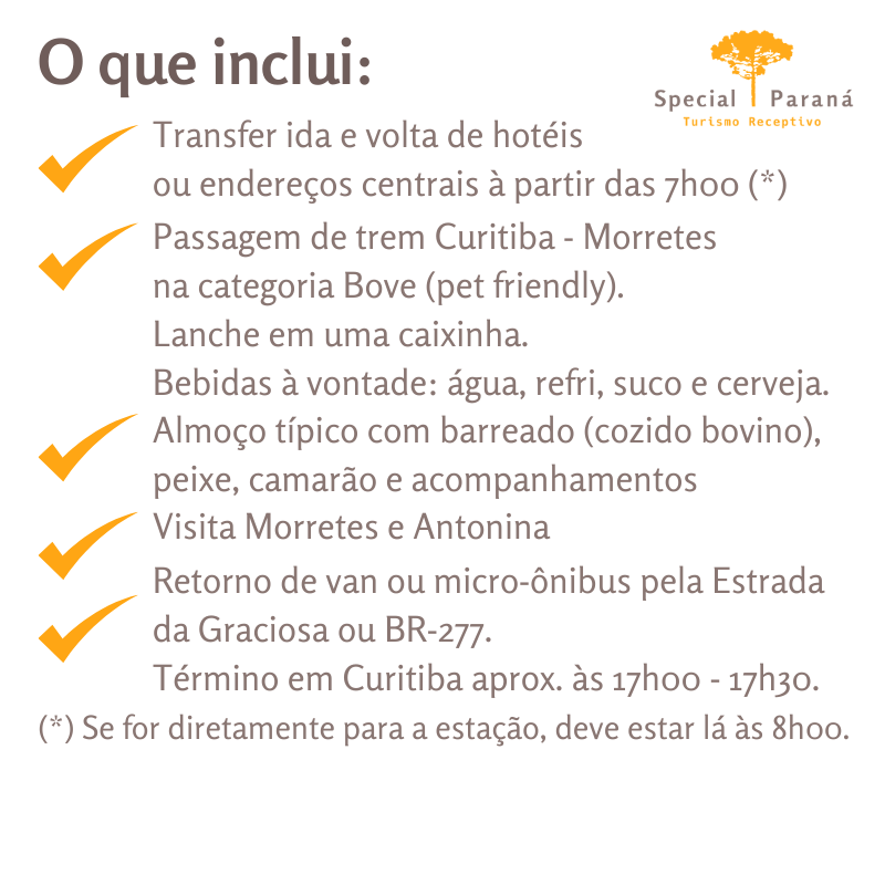 - Você terá transfer de ida e volta de hotéis ou endereços centrais em Curitiba à partir das 7h. Se preferir, pode ir diretamente para a Estação Ferroviária por conta própria. Informe onde estará hospedado ou reserve seu hotel conosco!