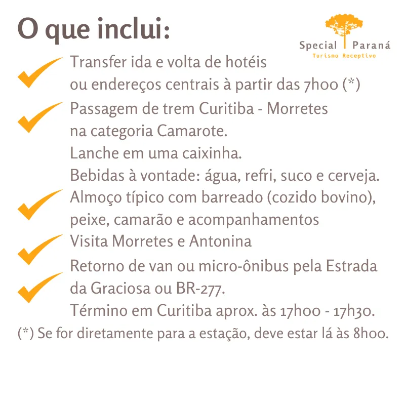 - Você terá transfer de ida e volta de hotéis ou endereços centrais em Curitiba à partir das 7h. Se preferir, pode ir diretamente para a Estação Ferroviária por conta própria. Informe onde estará hospedado ou reserve seu hotel conosco!
