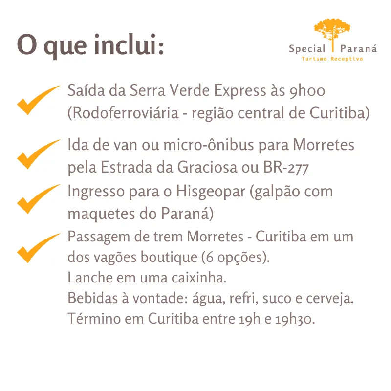 Não inclusos: apanhe no hotel, almoço, passeio guiado em Morretes, despesas pessoais, etc.