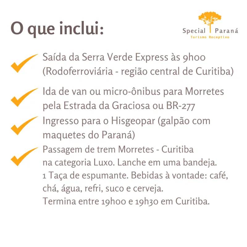 Não inclusos: apanhe no hotel, almoço, passeio guiado em Morretes, despesas pessoais, etc.